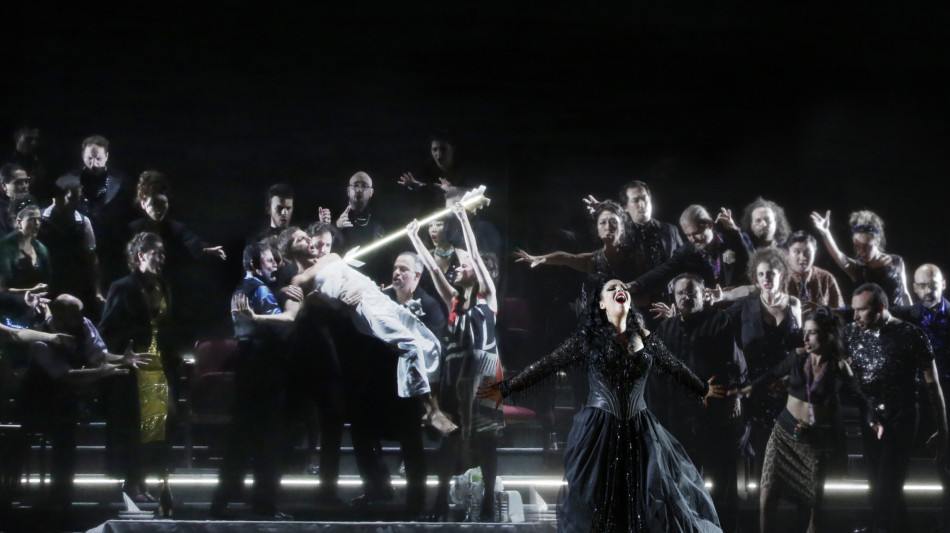 (di Federica Acqua) Nero il cielo in tempesta che a mo' di sipario annuncia il dramma, neri e un po' punk gli abiti contemporanei dei figuranti e del coro, nero il finale di morte per assassinio del deus ex machina della vicenda. È una tragedia nera la prima di Ermione messa in scena il 9 agosto alla Vitrifrigo Arena di Pesaro nel 45/simo Rossini Opera Festival e salutata da dieci minuti di applausi e ovazioni andati soprattutto al direttore d'orchestra Michele Mariotti e alla protagonista Anastasia Bartoli, grande in voce, tecnica e recitazione, ma condivisi anche dagli altri interpreti: Juan Diego Flòrez (Oreste), Victoria Yarovaya (Andromaca), Enea Scala (Pirro) e ancora Antonio Mandrillo, Michael Mofidian, Martiniana Antonie, Paola Leguizamòn e Tianxuefei Sun. Una tragedia non tanto di amori non corrisposti come prevede il libretto: Oreste che ama Ermione che invece ama Pirro che a sua volta ama Andromaca decisa a rimanere fedele al defunto marito Ettore, ma di amori che non vanno a segno per il semplice motivo che i protagonisti non sanno amare che sé stessi. Così la vede il regista Johannes Erath, che in un'ambientazione astratta e raffinata (scene di Heike Scheele) che incornicia l'azione in un susseguirsi di quadri viventi, introduce un bianco Cupido le cui frecce non vanno mai a segno. È dunque il dramma contemporaneo della solitudine e dell'incomunicabilità per egoismo che si consuma sul palco intorno a una tavola imbandita ove siedono personaggi volgari dagli abiti appariscenti, che si parlano da lontano assaporando il cibo separatamente anche in due tavoli posti ai lati del palcoscenico. Una frammentazione di affetti che in scena dalla tavola passa ad un teatro, ad indicare esistenze rivolte più all'apparenza che alla sostanza, metafora dei nostri giorni, e che si abbina ad una musica spezzata e oscillante che fa dell'Ermione una delle opere più moderne e singolari non solo di Rossini, ma della storia della lirica. Un'opera di sperimentazione l'aveva definita Mariotti che per tornare al Rof aveva posto come condizione la sua esecuzione, 'che sembra quasi un testo teatrale recitato in cui la parola si fa musica e le pause tolgono spazio al suono'. Un lavoro di cesello il suo con l'Orchestra Sinfonica Nazionale della Rai, i cantanti e il Coro del Teatro Ventidio Basso, che consegna al pubblico un capolavoro lirico poco eseguito e una primadonna Anastasia Bartoli, acclamata anche a scena aperta come gli altri protagonisti del cast nelle arie più significative, che a 33 anni promette di diventare una star. Costumi di Jorge Jara, video di Bibi Abel, luci di Fabio Antoci. Si replica il 13, 17 e 20 agosto.
